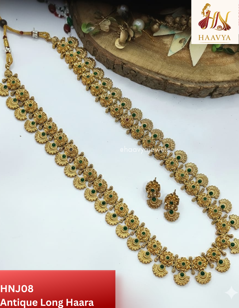 The Aesthetic: Step into the timeless allure of traditional artistry with our Antique Floral Heritage Haara. Designed for the woman who seeks a “traditional plus modern” look, this long necklace set captures the majestic weight of heirloom jewelry while maintaining a refined, wearable elegance. The deep, matte antique gold finish provides a sophisticated, vintage glow that serves as the perfect anchor for your festive wardrobe.
