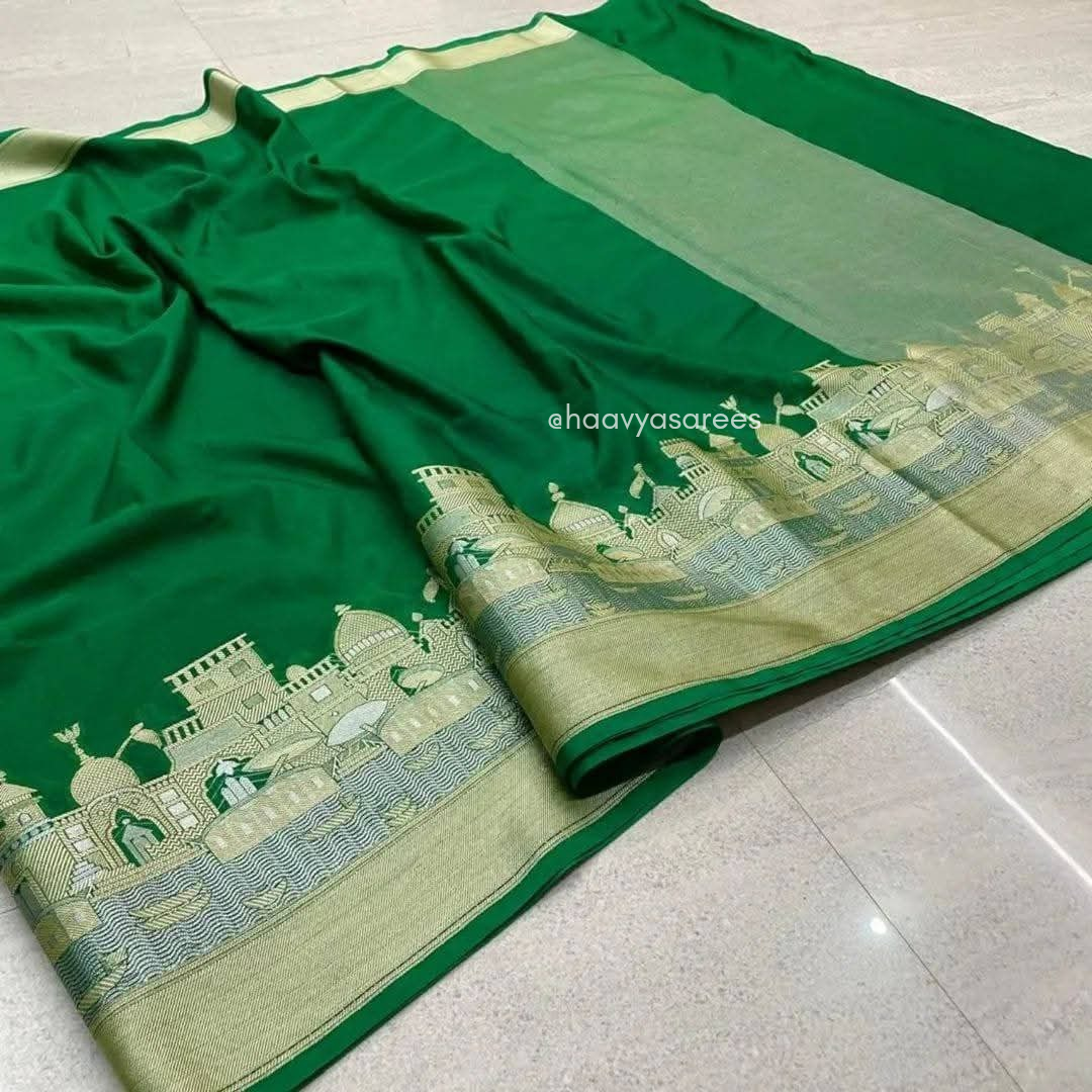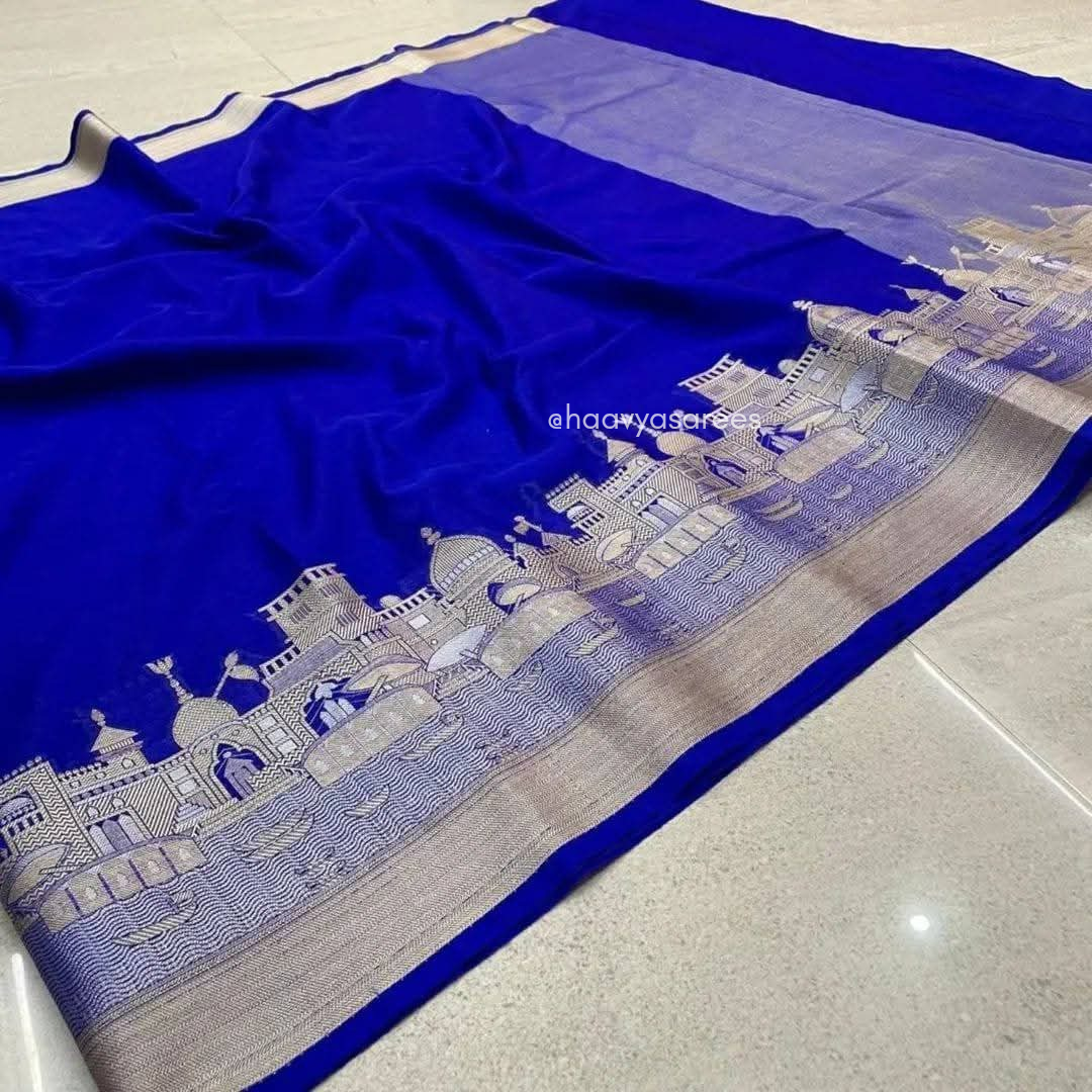 Heritage Border: Features a stunning, intricate Ghat design along the border, showcasing temple architecture and riverfront steps in shimmering zari.